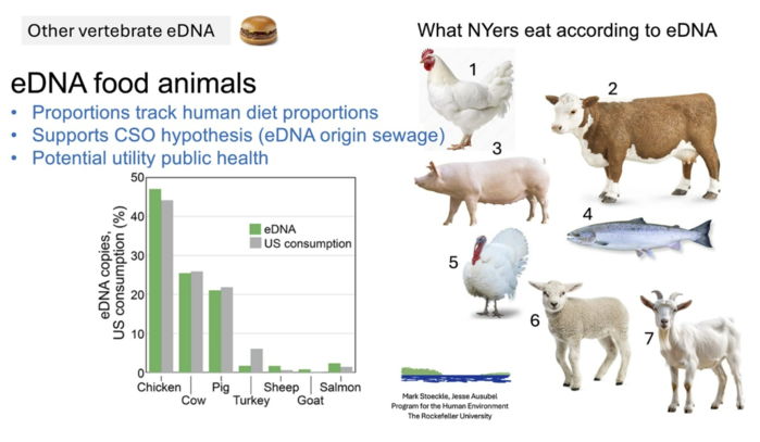"폭우가 내린 후에는 도시를 움직이는 거의 모든 생명체의 DNA가 이스트강으로 흘러들어간다"고 아우수벨은 말했다. "유전학적으로 볼 때, 폭우는 강을 마치 새해 전야의 타임스퀘어처럼 혼잡하고 시끄럽고 온갖 신호로 가득 찬 곳으로 변모시킨다." 이러한 신호들은 놀라운 통찰력을 제공했다. "우리는 이스트강에서 발견된 동물 DNA의 양이 전국적인 판매량 데이터와 밀접한 상관관계를 보인다는 것을 발견했다"며 "따라서 우리는 도시 하천의 DNA가 지역 도시 거주자들의 식습관에 대한 상당히 정확한 정보를 제공할 수 있다고 생각한다"고 아우수벨은 보고했다. 예를 들어, 수질 샘플에서 가장 흔하게 발견된 농장 동물 DNA는 닭이었는데, 닭은 뉴욕에서 가장 많이 소비되는 동물이기도 하다.