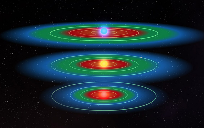 ▲ 생명체 거주 가능 영역의 위치는 중심별의 크기와 밝기에 따라 달라진다. 우리 태양계에서는 금성과 화성 사이에 위치한다. © NASA
