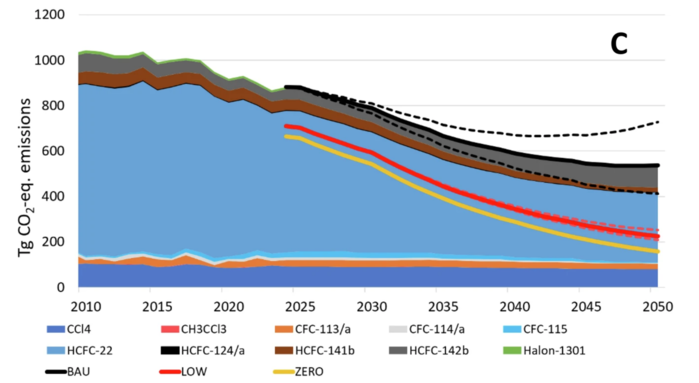 ▲ 원료로 사용되는 오존층 파괴 물질(ODS)의 과거 및 미래 배출량(2010~2050년)을 Gg/년(A), Gg-CFC-11 eq./년(B), Tg CO2 eq./년(C) 단위로 나타낸 그래프. 총 배출량은 원료 생산 및 사용과 기타 출처(예: 저장고 및 기타 기존 용도에서의 손실)에서 발생합니다. 2023년까지의 배출량은 NOAA(미국 해양대기청) 및 AGAGE(고급 지구 대기 가스 실험) 측정값을 기반으로 산출되었다. 2024년에서 2050년 사이의 배출량은 현상 유지(BAU) 시나리오를 기준으로 하며, 검은색 선은 모든 출처에서 발생하는 총 배출량을 나타낸다. 빨간색 선은 저배출 시나리오(LOW)에서 발생하는 배출량을, 노란색 선은 제로 시나리오(원료 생산 및 사용으로 인한 배출량을 제외하고 저장고 및 기타 기존 용도에서의 예상 배출량)를 나타낸다. (출처:Published: 16 April 2026