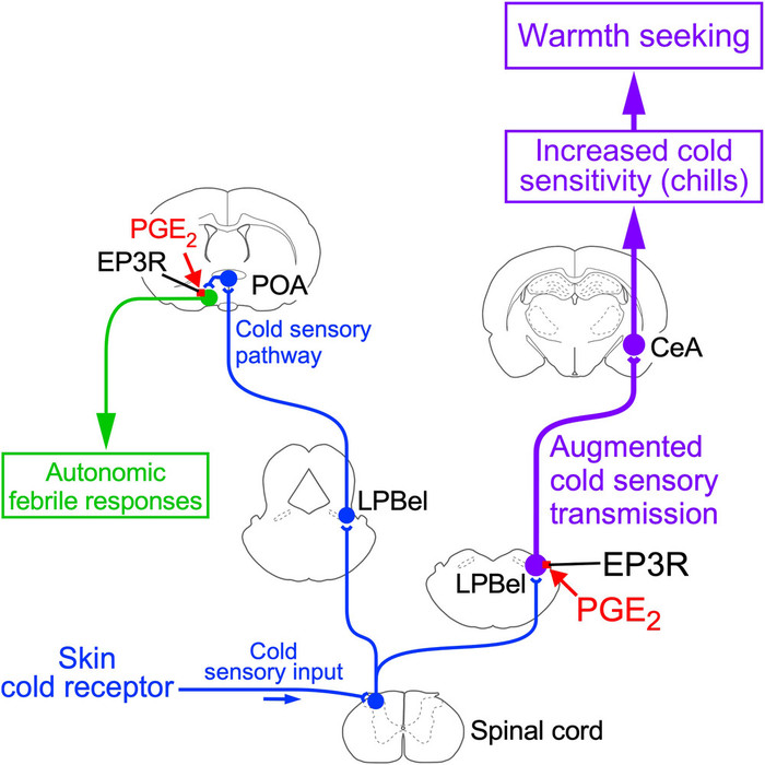추가 분석 결과, 이러한 열 추구 행동은 뇌간 중계소에 있는 특정 수용체인 EP3R 때문인 것으로 밝혀졌다. 이는 정상적인 추위 반응에서와 마찬가지로 편도체까지 이어지는 신호 전달 경로를 활성화시켜 열을 찾거나 추위를 피하는 행동을 유발한다. 그러나 흥미롭게도 쥐들은 이러한 프로스타글란딘에 대한 국소적 반응으로 인해 발열이 발생하지 않았다. 따라서 외측교뇌핵에서 편도체로 이어지는 신호 전달 경로는 체온을 변화시키지 않고 추위에 대한 주관적인 인식에만 영향을 미친다.