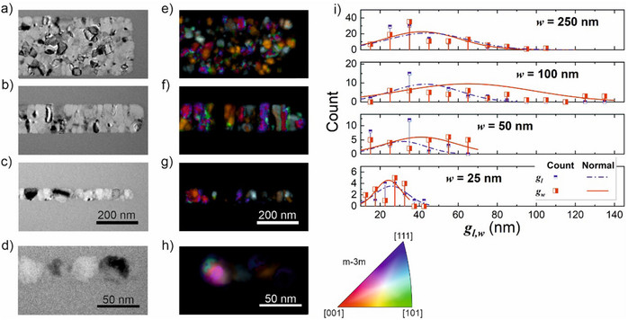 | ▲ 약 2 nm 직경의 집속된 Ne+ 이온 빔을 사용하여 단거리 질서형 Fe60V40 템플레이트 박막에 새겨진 결정 영역의 구조. 스트라이프 형상의 조사 영역에 대한 TEM 명시야 이미지를 보여주며, 스트라이프 폭은 a) 250 nm, b) 100 nm, c) 50 nm, d) 25 nm다. 명시야 이미지에 해당하는 SPED 미세사진은 각각 e~h)에 나타냈다. 오른쪽 하단의 색상 스케일은 z축에 대한 국부적인 결정학적 방향을 나타낸다. 결정립 크기 분포는 i)에 나타냈으며, gl과 gw는 각각 스트라이프의 길이와 폭에 평행한 축을 따라 측정한 결정립 크기다. (출처:Confinement Driven Spin-Texture Evolution in Directly Written Nanomagnets / Advanced Functional Materials / 09 September 2025) |