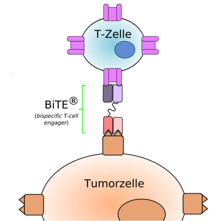 | ▲ BiTE 항체는 한쪽 끝으로는 면역 체계의 T 세포에 결합하고, 다른 쪽 끝으로는 세포 표면의 특정 단백질, 즉 이 경우에는 암세포 표면에 결합할 수 있다. © Armin Kübelbeck/ CC-by-sa 3.0 |