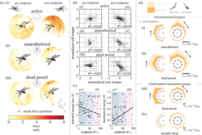 | ▲ 그림 3. 수동적인 공중 자세 회복 및 역학. (a) 활성 (i), 마취 (ii) 및 자세 (iii) 조건에 대한 회복 중간 점 전후의 힘 벡터 및 크기의 방향. (출처: 관련 논문 Dragondrop: a novel passive mechanism for aerial righting in the dragonfly) |