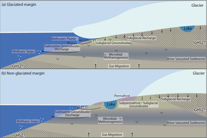 ▲ 이 지역의 잠재적 지하 유체 및 가스 시스템을 보여주는 개념 모델. 가스 하이드레이트(GH)는 북극과 남극의 많은 빙하 아래뿐만 아니라 해저에서도 발견된다. 가스 하이드레이트는 얼어붙고 얼어붙는 한 안정적으로 유지된다. 그러나 이 가스 하이드레이트 안정대(GHSZ)는 빙하가 후퇴함에 따라 사라진다. 또한, 따뜻해지는 해저는 메탄을 방출할 수도 있다. © Seabrook et al./ Nature Communications, CC-by-nc-nd 4.0 / 육지-해양 연속체 전체의 연결성은 (a) 빙하기 주변부와 (b) 비빙하 주변부를 따라 표시되어 있다. 개념 모델은 축척에 따라 그려지지 않았다. (출처:Published: 01 October 2025 / Antarctic seep emergence and discovery in the shallow coastal environment / nature communications) |