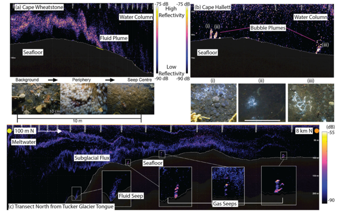 ▲ 케이프 휘트스톤의 수심 190m에서의 유체 플룸. 연관된 이미지는 유체 플룸에 해당하는 해저 생물 군집의 전환을 보여줍니다(이미지 설명: [배경] 해면동물, 이끼벌레, Sabellid 관충류, 소행성, 홀로투리아스, 오피우로이드 및 줄기가 있는 피낭동물; [주변] 해면동물 매트 위의 줄기가 있는 해초류, 이끼벌레, 이끼벌레 매트 위의 오피우로이드 및 오피우로이드; [침수 중앙] 홀로투리아스, 작은 흰색 오피우로이드 및 줄기가 있는 해초류가 있는 두껍고 갈색의 해초류 매트. b Cape Hallett의 수심 50~60m에서 거품 플룸과 거품 플룸에 해당하는 해저 미생물 매트의 이미지(i, ii 및 iii로 표시). c Tucker Glacier Ice Tongue에서 북쪽으로 100m(노란색 점으로 표시)에서 시작하여 북쪽으로 약 8km(표시)를 통과하는 음향 횡단면. (주황색 점으로 표시) 해안과 평행하게 흐르는 흐름. 빙설(ice tongue)에서 나오는 융해수, 빙설 아래에서 흘러나오는 빙하하 플럭스, 그리고 해저를 따라 흘러나오는 유체 및 가스에 대한 해석이 표시되어 있다. (출처:Published: 01 October 2025 / Antarctic seep emergence and discovery in the shallow coastal environment / nature communications) |