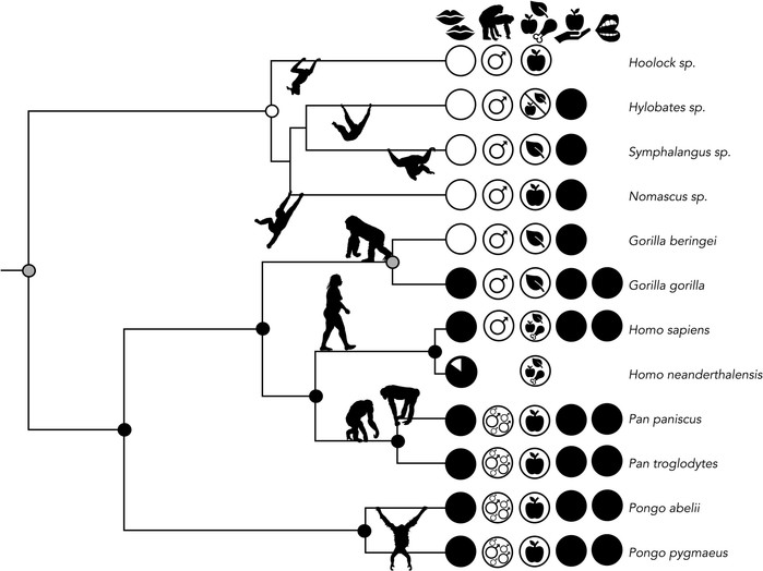 | ▲ 유인원(Hominoidea) 내 키스의 재구성된 진화적 역사를 보여주는 계통발생학. 키스의 발생과 기타 생활사 변수는 계통수 끝에 표시되어 있다(보충 자료). 왼쪽에서 오른쪽으로: 키스(관찰됨/관찰되지 않음); 짝짓기 체계(단일/다수 수컷); 식이(엽식, 과실식, 잡식); 먹이 공유(있음/없음); 그리고 씹기 전(있음/없음). 계통수의 끝과 마디에서 검은색 원은 특성이 보고되었거나 '있음'으로 재구성되었음을 나타낸다. 흰색 원은 키스가 보고되지 않았거나 '없음'으로 재구성되었음을 나타낸다. 회색 원은 모호한 재구성(평균 확률 <0.65)을 나타낸다. 데이터가 없는 곳에는 원이 없다. 네안데르탈인의 끝은 베이지안 추정에 기반한 키스가 '있음'일 평균 확률을 나타낸다. 10kTrees 프로젝트(Arnold et al., 2010)에서 얻은 10,000개의 분자 계통수 샘플을 사용하여 생성된 최대 분기 신뢰도 트리다. (출처: A comparative approach to the evolution of kissing / 19 Nov 2025 / Evolution and Human Behavior) |