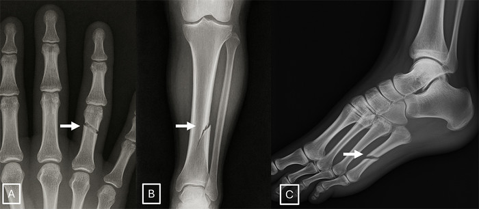 | ▲ GPT-4o로 생성된 골절 방사선 사진의 예: (A) 손의 후전방 방사선 사진, (B) 하퇴의 후전방 방사선 사진, (C) 발의 내측 사선 방사선 사진. 이미지에서 골절선(화살표)은 비정상적으로 매끄럽고 깨끗하며 일관성을 보이고, (B)의 경우 단일 피질 골절입니다. 이러한 비정상적인 매끄러움과 불완전한 피질 파괴를 특징으로 하는 이상적인 골절선의 존재는 인공지능으로 생성된 외상 이미지를 식별하는 주요 진단 단서로 활용될 수 있다. (출처:Mar 24 2026 / The Rise of Deepfake Medical Imaging: Radiologists’ Diagnostic Accuracy in Detecting ChatGPT-generated Radiographs / Radiology) |