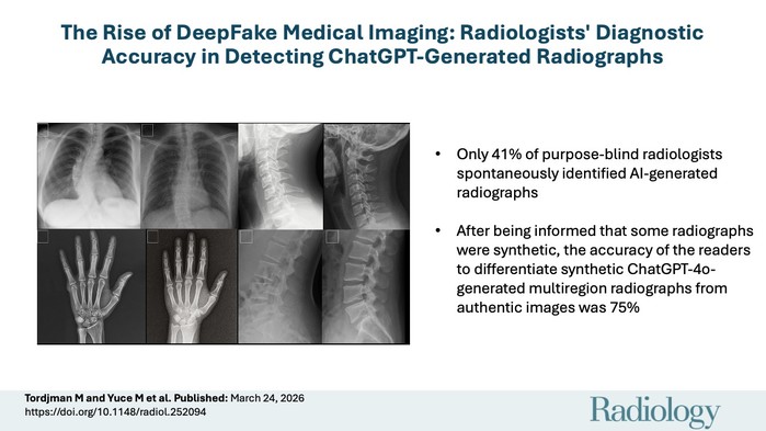 인공지능이 생성한 가짜 엑스레이가 너무나 실제 같아서 경험 많은 방사선 전문의조차 속아 넘어가는 실험 결과가 나왔다. 실험에 참여한 방사선 전문의 중 41%만이 AI가 생성한 딥페이크임을 알아챘다. 사전에 경고를 받았을 때는 75%가 가짜임을 식별했다. 심지어 일반적인 AI 모델조차 모든 가짜를 탐지하지 못했다.