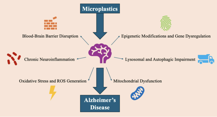 미세 플라스틱은 뇌에 침투하면 다섯 가지 방식으로 손상을 일으킬 수 있다. 연구에 따르면, 플라스틱 입자는 혈액-뇌 장벽을 통과하여 보호 장벽에 틈을 만든다. 뇌에 침투한 미세 플라스틱은 미토콘드리아 기능을 교란하고 만성 염증을 유발하며 세포에 산화 스트레스를 유발하고 뇌세포를 물리적으로 손상시킬 수도 있다. 이 모든 것이 결국 알츠하이머병이나 파킨슨병과 같은 질병의 원인이 될 수 있다.