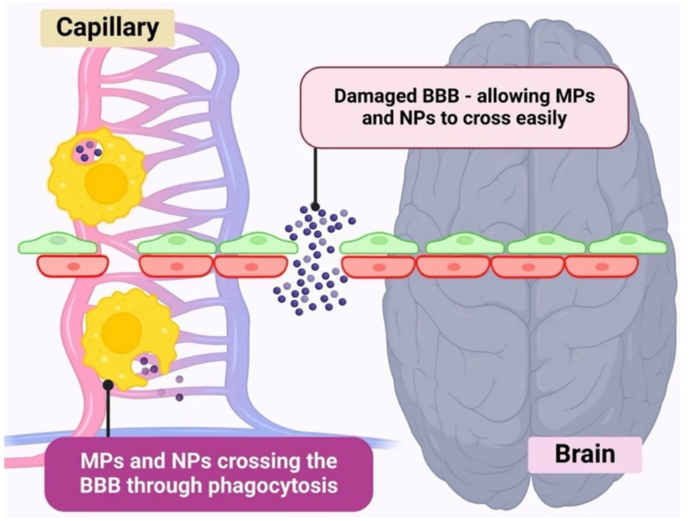 혈액-뇌 장벽과 기계적 세포 손상이 과정은 우리 뇌의 가장 중요한 보호 장벽인 혈액-뇌 장벽에 기계적 손상이 발생하는 것으로 시작된다. 시아의 동료 카말 두아(Kamal Dua)는 "미세 플라스틱은 이 장벽을 약화시켜 투과성을 높인다"며 "이로 인해 면역 세포와 염증 매개체가 활성화되어 혈액-뇌 장벽 세포에 더 큰 손상을 입힌다"고 설명했다. 결과적으로 장벽에 틈이 생겨 플라스틱 입자뿐만 아니라 다른 물질도 뇌로 침투할 수 있다.