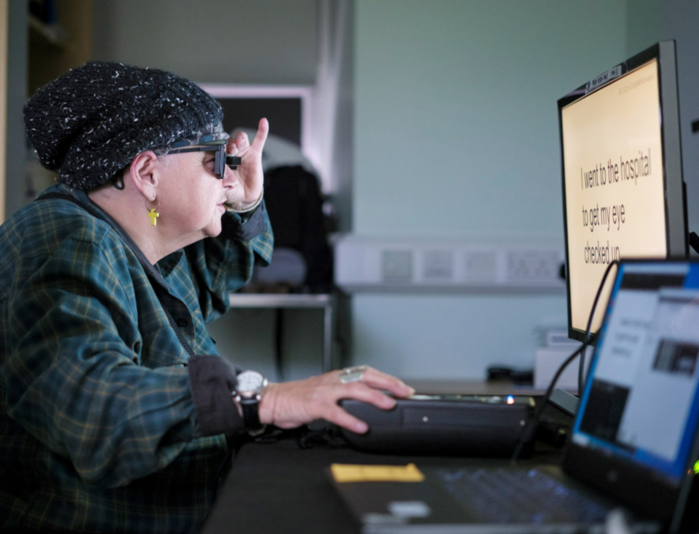 ▲ AMD 환자 쉴라 어바인이 마이크로칩 이식 후 특수 안경을 착용하고 훈련하고 있다. © 무어필즈 안과 병원 |