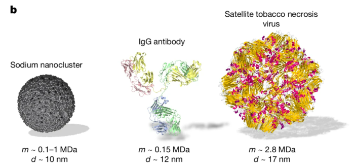 ▲ a. 선택된 양자 실험의 거시성 값. 파란색 원은 원자 간섭계를, 빨간색 마름모는 분자 간섭계를, 주황색 십자는 보스-아인슈타인 응축물(BEC)을, 녹색 사각형은 기계적 공진기를, 빨간색 별은 본 연구에서 사용된 μ = 15.5인 나트륨 나노클러스터를 나타낸다. b. 크기와 복잡성의 시각화. 본 연구에서 조사한 나트륨 클러스터는 약 0.2 MDa에서 양자 입자처럼 거동하며, MDa 영역까지 높은 대비를 보인다. 원자의 수와 질량은 대형 단백질 및 소형 바이러스의 그것과 유사하다(단백질 데이터베이스53 참조). (출처:Published: 21 January 2026 / Probing quantum mechanics with nanoparticle matter-wave interferometry /natire)