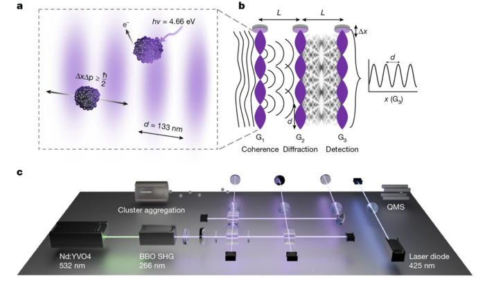 실험을 위해 연구팀은 자외선 레이저 빔을 이용해 세 개의 회절격자를 제작했다. 이 빔들은 이중 슬릿 실험에서 격자처럼 작용하는 정상파를 생성한다. 만약 금속 구체가 고전적인 거시적 물체처럼 행동한다면, 이 격자를 통과하는 경로는 명확하게 결정될 것이다. 하지만 금속 나노입자가 양자 입자처럼 행동한다면, 그 파동적 성질로 인해 간섭무늬가 나타날 것이다.