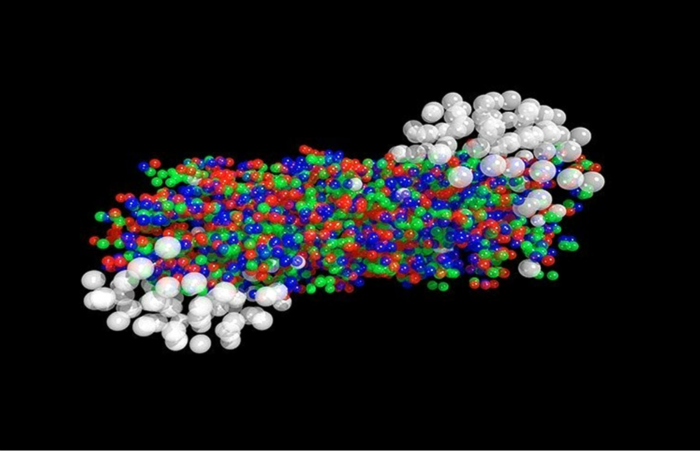 | ▲ 납 핵의 충돌로 생성된 쿼크-글루온 플라스마: 자유 쿼크는 빨강, 파랑, 초록으로, 손상되지 않은 양성자와 중성자는 흰색으로 표시되어 있다.