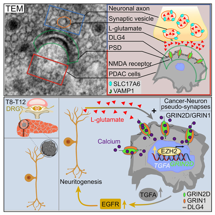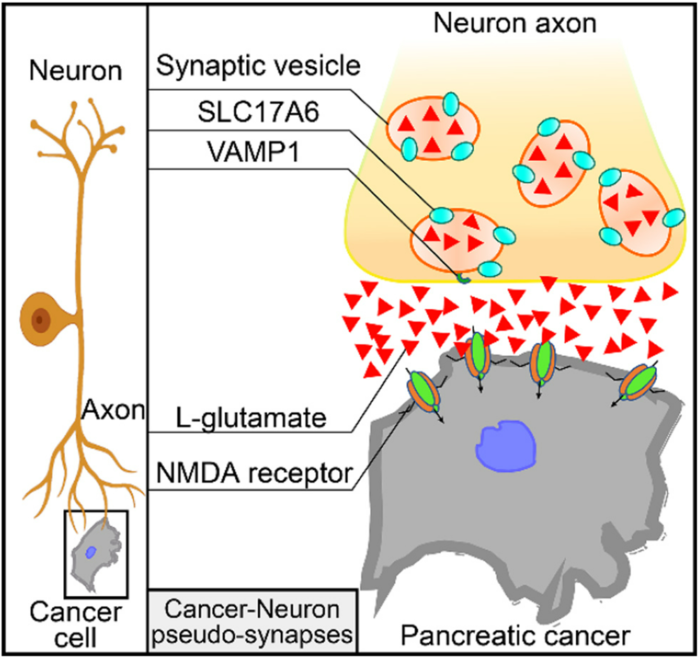 암은 신경 말단과 고유한 접점을 형성한다.실제로 분석 결과 췌장 종양은 우리 신경과 특별한 접점을 형성한다는 것이 밝혀졌다. 이러한 유사시냅스는 신경계의 시냅스와 구조적으로 유사하다. 연구진은 "접촉점 막에서 고도로 조직화되고 전자 밀도가 높은 영역이 관찰되었는데, 이를 시냅스후 응축으로 확인했다"며 "이는 중추신경계의 흥분성 시냅스의 미세 구조와 일치한다"고 보고했다.