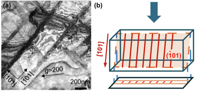 | ▲ 그림 7a에 표시된 국소 영역을 보여주기 위해 확대된 4번 잎의 BF-TEM 이미지. 주기적 패턴으로 배열된 많은 전위선을 가진 슬립 밴드가 [101] 방향을 따라 형성된다. b a의 슬립 밴드를 설명할 수 있는 4번 잎의 슬립 평면과 전위의 개략도. 파란색 화살표는 해머링 방향(대략 [001])을 나타냅니다. 슬립 평면은 평면으로 결정되었다. 전위는 나사 전위에 해당하는 [101] 방향의 버거 벡터로 양쪽 표면에서 끝납니다. 전위선은 스크린에 투영된다. (출처:Published: 26 September 2025 / Deformation mechanism behind the unique texture of Kanazawa gold leaf / npj, heritage science) |