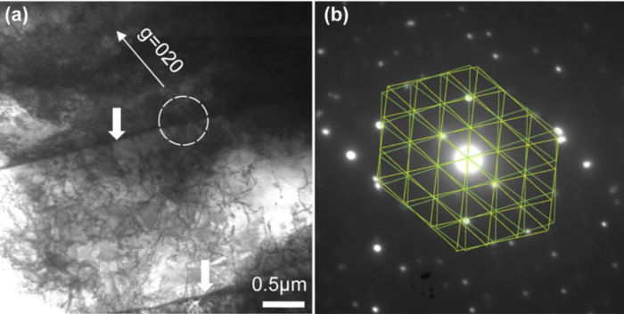 a. g = 020 조건에서 Zumi 포일의 2빔 명시야(BF)-TEM 이미지. b a에서 점선 흰색 원의 국소 회절 패턴. (출처:Published: 26 September 2025 / Deformation mechanism behind the unique texture of Kanazawa gold leaf / npj, heritage science) |