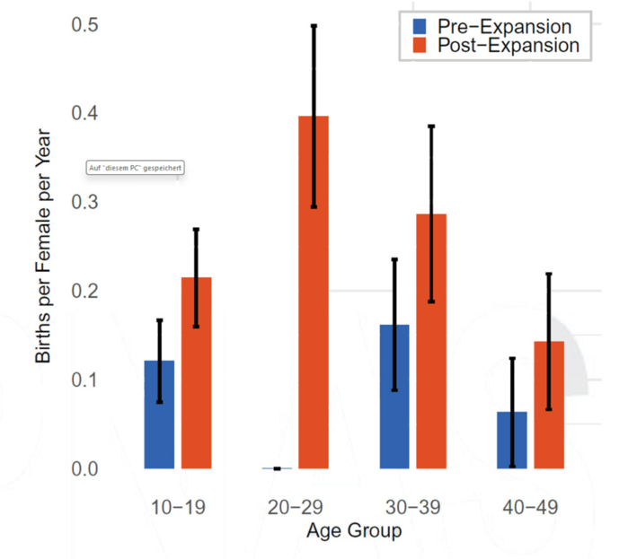 | ▲ 영토 정복 전후 3년간 암컷 응고족 침팬지의 출산율. © Wood et al./ PNAS, CC-by 4.0 |