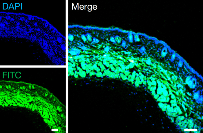 | ▲ 녹색 형광은 OP 결합 인슐린이 마우스 피부를 통과했음을 나타낸다.