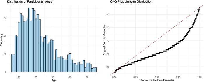 | ▲ 참가자 연령 분포. 히스토그램은 참가자 연령 분포를 보여주고(왼쪽), Q-Q 플롯은 데이터가 균일 분포를 얼마나 잘 따르는지 평가했다(오른쪽). (출처:Memory bumps across the lifespan in personally meaningful music / Taylor & Francis) |