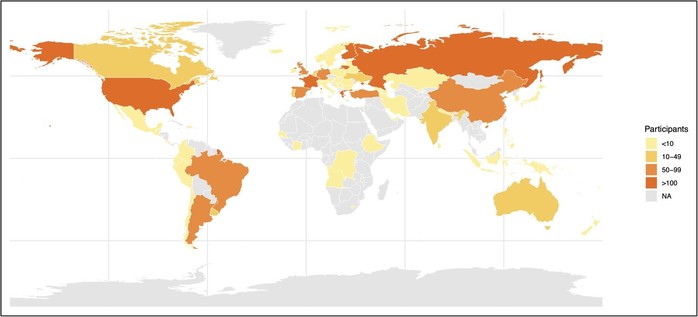| ▲ 설문조사 참여자의 전 세계 분포.(출처:Memory bumps across the lifespan in personally meaningful music / Taylor & Francis) |