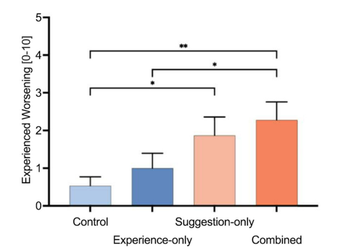 ▲ 인위적으로 유발된 내장 통증을 경험한 그룹에서, 부정적인 암시와 부정적인 경험이 결합될 때 증상이 유의미하게 악화되는 것이 관찰됐다. © Aulenkamp et al./ Pain, CC-by-nc-nd 4.0