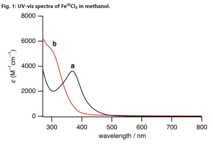 | ▲ a) 메탄올 용액에 녹인 FeIIICl3(0.25 mM)의 UV-vis 스펙트럼(공기 중) 및 b) 메탄올 용액에 녹인 FeIIICl3(0.25 mM)와 NaOH(90 mM)를 첨가한 용액의 UV-vis 스펙트럼(공기 중). 셀 길이는 1.0 cm이다. (출처: Published: 17 April 2026 / Iron ion enables photocatalytic hydrogen evolution from methanol / communications chemistry) |