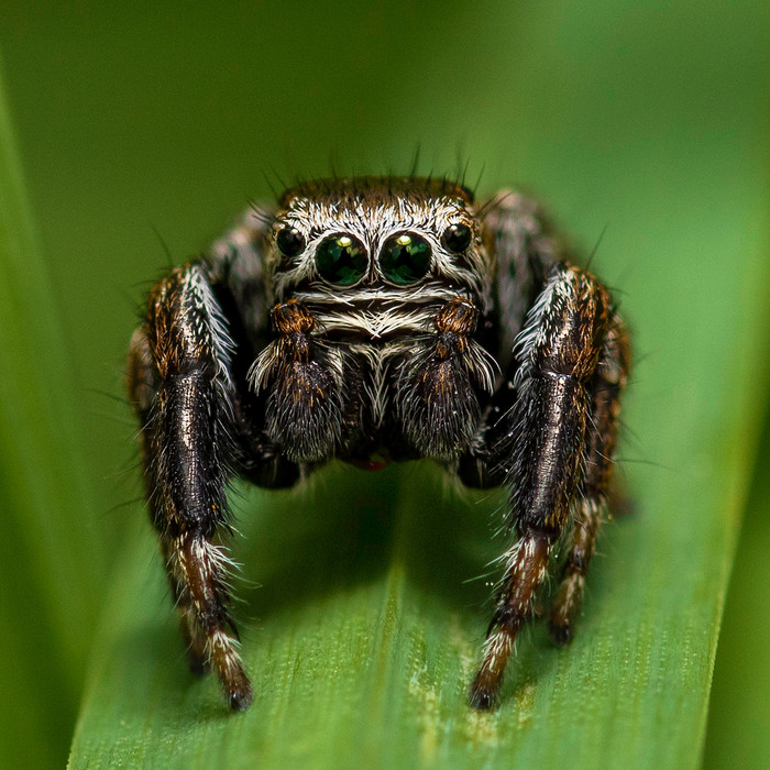다크 시클백(Evarca arvuata)의 이 사진에서 깡충거미의 전형적인 감시하는 눈을 뚜렷이 볼 수 있지만, 총 8개의 눈 중 앞눈 4개만 사진에 나와 있다. 두 개의 크고 앞을 향한 주(主)눈(main eyes) 덕분에 이 거미는 뛰어난 시력을 가지고 있으며 자외선도 감지할 수 있다.