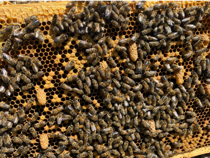 | ▲ 꿀벌 프레임에 있는 여러 개의 대체 셀은 일벌들이 대체 여왕벌을 키우고 있음을 나타낸다. © Shelley Hoover |