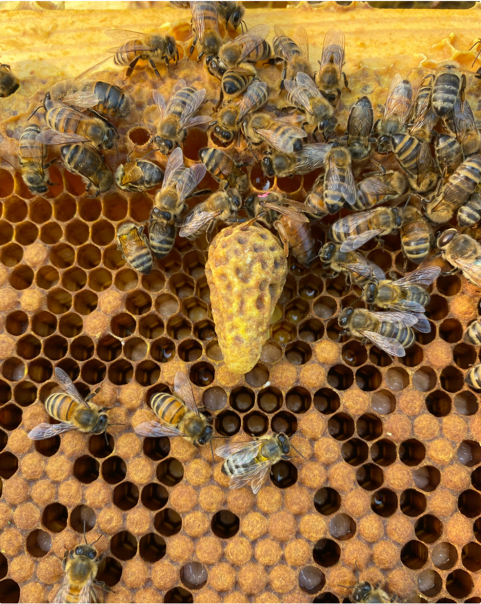 | ▲ 대체 셀(땅콩 모양 구조물, 가운데) 위에 서 있는 여왕벌. 분리된 셀에는 일벌들이 대체용으로 키운 새로운 여왕벌이 있다. © Shelley Hoover |