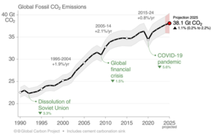 중국과 인도의 영향으로 이산화탄소 증가세 둔화하지만 긍정적인 소식도 있다. 2005년부터 2015년까지의 10년과 비교했을 때, 토지 이용과 화석 연료를 합친 인위적인 이산화탄소 배출량이 소폭 감소했다. 엑서터 대학교의 피에르 프리들링슈타인(Pierre Friedlingstein)과 그의 연구팀은 "2025년까지 연평균 0.3%씩 증가할 것으로 예상되며, 이는 이전의 1.9%에서 감소한 수치다"고 보고했다. 또한 미국과 유럽 연합을 포함한 전 세계 35개국이 적어도 경제 성장률 대비 화석 연료 이산화탄소 배출량을 줄였다.