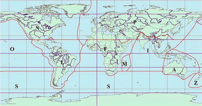 ▲ 전 세계 조류 형질 데이터세트인 BIRDBASE에 사용된 세계 생물지리 영역 지도. 빨간색 선은 각 영역을 둘러싸고 있습니다. A = 호주; F = 아프리카 열대 및 사하라 이남 대륙 아프리카; I = 인도말레이시아; L = 신열대; M = 마다가스카르 및 인근 섬; N = 북반구; O = 오세아니아; P = 구북구; S = 남극; Z = 뉴질랜드 및 인근 섬. 월라세아는 이 지도에는 표시되지 않았지만 호주와 인도말레이 영역 사이에 위치해 있다. 보라색 선은 본초 자오선(수직)을 나타내며, 위도상으로는 위에서 아래로 북극권, 북회귀선, 적도, 남회귀선, 남극권을 나타낸다. Şekercioğlu, Ç.H., Daily, G.C., Ehrlich, P.R. 2004. Ecosystem consequences of bird decreases에서 수정하여 재인쇄. PNAS 101: 18042-18047. 저작권 (2004) 미국 국립과학원.(출처:Published: 30 September 2025 / BIRDBASE: A Global Dataset of Avian Biogeography, Conservation, Ecology and Life History Traits / Scientific Data) |