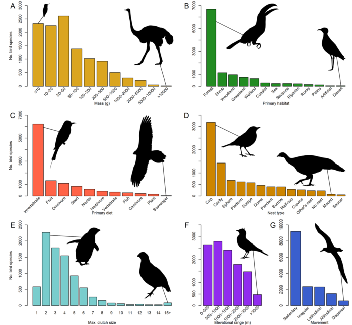 ▲ 전 세계 조류 형질 데이터세트인 BIRDBASE에서 제공하는 7가지 예시 형질의 변이. 막대는 각 형질의 범주 또는 하위 집합에 속하는 종의 수를 나타낸다. (A) 평균 체중, (B) 주요 서식지, (C) 주요 먹이, (D) 둥지 유형, (E) 최대 알무리 수, (F) 고도 범위, (G) 이동 전략. 이동의 경우, 부분 위도 이동과 전체 위도 이동을 함께 그룹화했다. 둥지 유형과 이동을 나타내는 각 막대는 해당 둥지 유형을 이용하거나 특정 이동 전략을 수행할 수 있는 종의 총 수를 나타낸다. (즉, 한 종이 두 가지 이상의 둥지 유형이나 이동 유형을 가진 경우, 각 범주별로 별도로 계산합니다.) 예시 종(왼쪽에서 오른쪽으로, 위에서 아래로)에는 벌벌새(Mellisuga helenae), 타조(Struthio camelus), 용골부리큰부리새(Ramphastossulfatus), 크림색 큰부리새(Cursorius 커서), 무지개벌잡이(Merops ornatus), 수염수리(Gypaetus barbatus), 중국검은새(Turdus mandarinus), 말리새(Leipoa ocellata), 아델리펭귄(Pygoscelis adeliae), 북부밥화이트(Colinus virginianus), 뿔종달새(Eremophila alpestris), 눈알바트로스(Diomedea exulans). (출처:(출처:Published: 30 September 2025 / BIRDBASE: A Global Dataset of Avian Biogeography, Conservation, Ecology and Life History Traits / Scientific Data) |