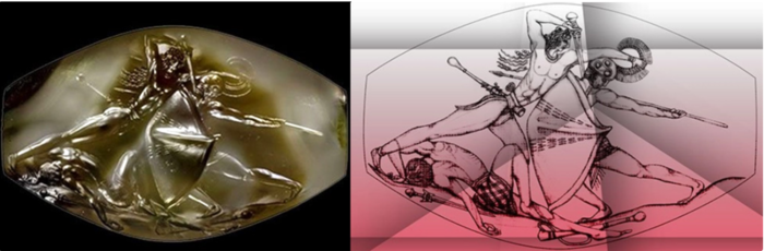 | ▲ 미케네 전쟁 무덤에서 출토된 미노아 문명의 인장과 그 인장에 묘사된 인물의 그림 © University of Cincinnati |