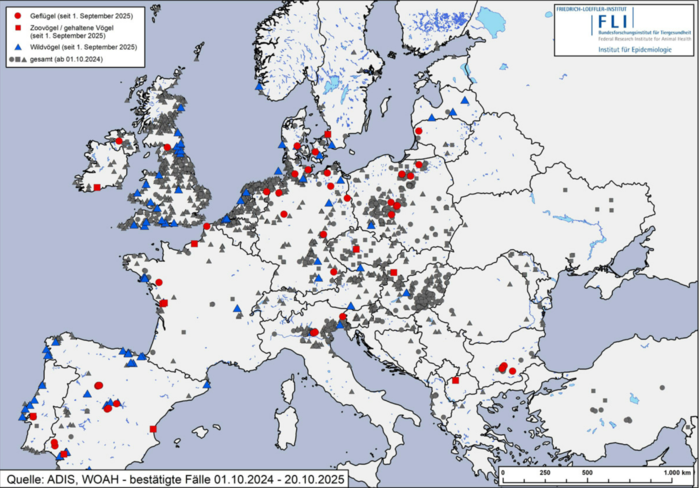 ▲ 2024년 10월 이후 유럽에서 보고된 H5N1 조류 인플루엔자 사례. © Friedrich-Loeffler-Institut (FLI)