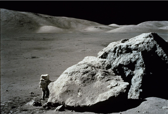 ▲ 아폴로 17호 우주비행사 해리슨 H. 슈미트가 세레니타티스 해협의 타우루스-리트로 지역에 있는 달 암석 옆에 서 있다. © NASA |