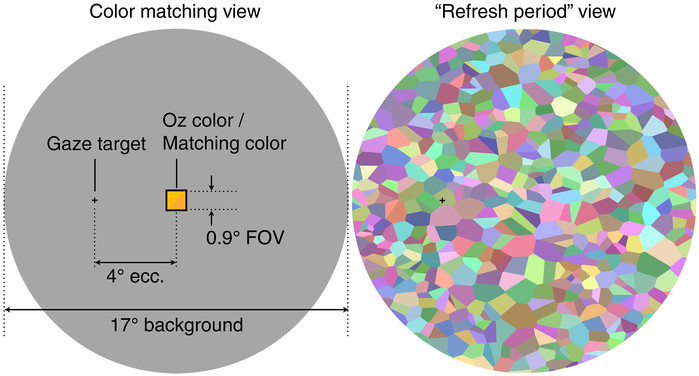 왼쪽은 실험 장면을 보여준다. 오른쪽은 15초 주기적인 "갱신 기간" 동안 나타난 여러 색상의 모자이크의 예시다. (출처:Novel color via stimulation of individual photoreceptors at population scale / Science Advances / 18 Apr 2025) |