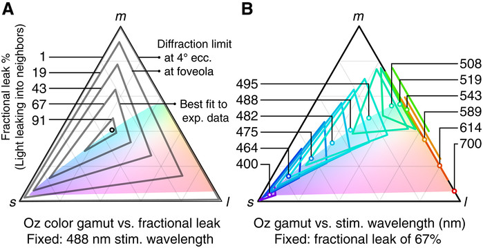 (A) 분수 누출이 증가함에 따라 색역은 전체 lms 색도 삼각형에서 자극 파장(흰 원)까지 줄어든다. 이 비율은 망막 전체에 걸쳐 달라지는 원뿔 간격에 따라 달라진다. 채색 영역은 인간의 자연스러운 색역이다. (B) 색역은 자극 파장에 따라 색도, 위치, 모양이 달라진다. 가독성을 위해 543nm와 589nm 색역의 추가 사본을 lm 가장자리 옆에 표시했다. |