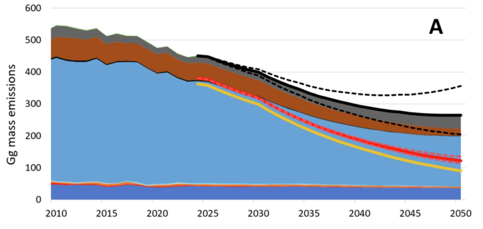 ▲ 원료로 사용되는 오존층 파괴 물질(ODS)의 과거 및 미래 배출량(2010~2050년)을 Gg/년(A), Gg-CFC-11 eq./년(B), Tg CO2 eq./년(C) 단위로 나타낸 그래프. 총 배출량은 원료 생산 및 사용과 기타 출처(예: 저장고 및 기타 기존 용도에서의 손실)에서 발생합니다. 2023년까지의 배출량은 NOAA(미국 해양대기청) 및 AGAGE(고급 지구 대기 가스 실험) 측정값을 기반으로 산출되었다. 2024년에서 2050년 사이의 배출량은 현상 유지(BAU) 시나리오를 기준으로 하며, 검은색 선은 모든 출처에서 발생하는 총 배출량을 나타낸다. 빨간색 선은 저배출 시나리오(LOW)에서 발생하는 배출량을, 노란색 선은 제로 시나리오(원료 생산 및 사용으로 인한 배출량을 제외하고 저장고 및 기타 기존 용도에서의 예상 배출량)를 나타낸다. (출처:Published: 16 April 2026