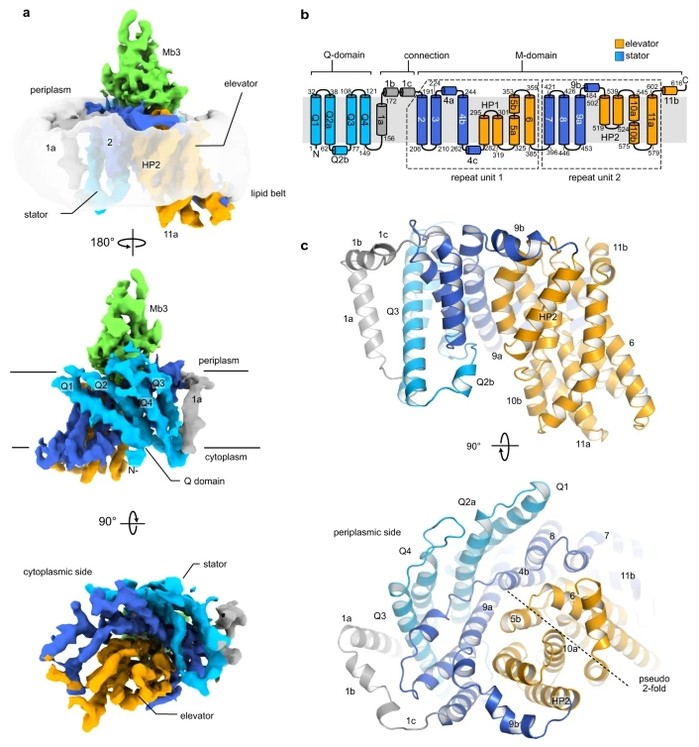 | ▲ a. 지질 나노디스크에서 Mb3와 복합된 HiSiaQM의 3D 재구성(등고선 수준 0.384). 나노디스크의 지도는 지질 이중층의 상대적 위치를 표시하기 위해 투명한 회색으로 오버레이되었다. 선택된 2차 구조 요소가 표시된다. 개별 도메인과 해당 색상 코드는 패널(b)에서 식별된다. b HiSiaQM의 토폴로지 다이어그램. c (a) 및 (b)에서와 같은 색 구성표로 HiSiaQM의 만화 표현. 2차 구조 요소가 표시된다. (출처: 관련논문 Structural and mechanistic analysis of a tripartite ATP-independent periplasmic TRAP transporter / nature communications) |