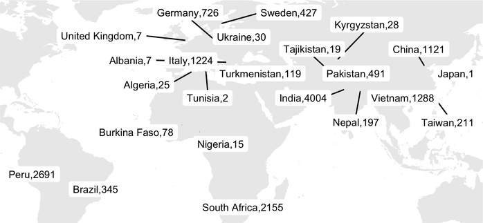 | ▲ 15,211개의 CryPTIC Mycobacterium tuberculosis 임상 분리주의 지리적 분포("전체" 데이터 세트). 각 국가에서 제공한 총 분리주 수가 표시된다. 분리주의 기원을 알 수 없는 경우 채집지 식별이 지정됨(독일 269주, 인도 17주, 페루 6주, 이탈리아 885주, 남아프리카 510주, 스웨덴 357주) , 대만 208주, 브라질 1주, 영국 4주). (http://www.naturalearthdata.com/about/terms-of-use/ 참조)(github.com/kerrimalone/Brankin_Malone_2022/ 참조). 출처: 관련논문 A data compendium associating the genomes of 12,289 Mycobacterium tuberculosis isolates with quantitative resistance phenotypes to 13 antibiotics / PLOS Biology) |