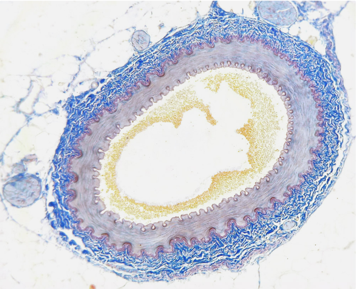 | ▲ 동맥의 단면도. 동맥경화증에서는 혈관 내벽이 침착물, 침윤된 혈관벽 세포 및 염증으로 인해 두꺼워진다. © Lord of Konrad / CC0 |