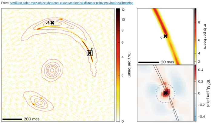중력 호의 미묘한 교란이제 새롭게 발견된 "어두운 천체"가 더 많은 통찰력을 제공할 수 있다. 막스 플랑크 천체물리학 연구소의 데본 파월이 이끄는 천문학자들은 미국의 초장기선 배열(VLBA)과 유럽의 초장기선 간섭계 네트워크(EVN)를 포함해 전 세계에 분산된 전파 관측소 네트워크를 사용하여 이 천체를 발견했다. 이 두 관측소를 연결하면 지구 크기의 가상 전파 망원경이 형성된다.