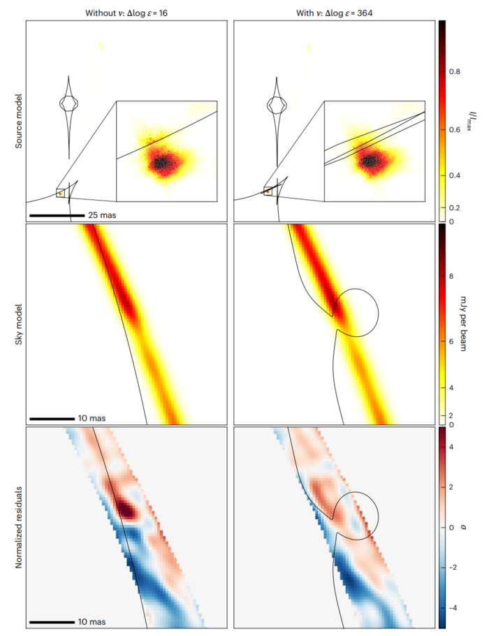 없는 모델에서 소스 모델은 밝은 렌즈 호의 틈새를 채우려 시도하며, 이로 인해 렌즈 화선(왼쪽 열)을 따라 표면 밝기에 급격한 불연속성이 발생한다. ν의 중력 효과는 화선을 밝은 전파 로브 위로 접어 이 불연속성을 보정하고 매끄럽고 연속적인 이미지를 복원했다(오른쪽 열). 밝고 네 번 촬영된 소스 성분 주변의 삽입 영역은 한 변의 길이가 4밀리초(ms)다. 또한 밝은 성분의 북쪽으로 약 50ms 거리에 훨씬 희미하고 두 번 촬영된 소스 성분이 존재하는 것을 주목하시오. 가운데 줄, 렌즈 평면 표면 밝기 지도(점 확산 함수의 주 로브와 재합성곱). 호의 틈새는 ν 없는 모델에서도 여전히 존재한다. 이 경우 소스는 불연속성을 흡수하려고 시도했다. 아랫줄은 가시성 평면에서 정규화되고, 시각화의 용이성을 위해 이미지 평면으로 푸리에 변환된 나머지값이다.