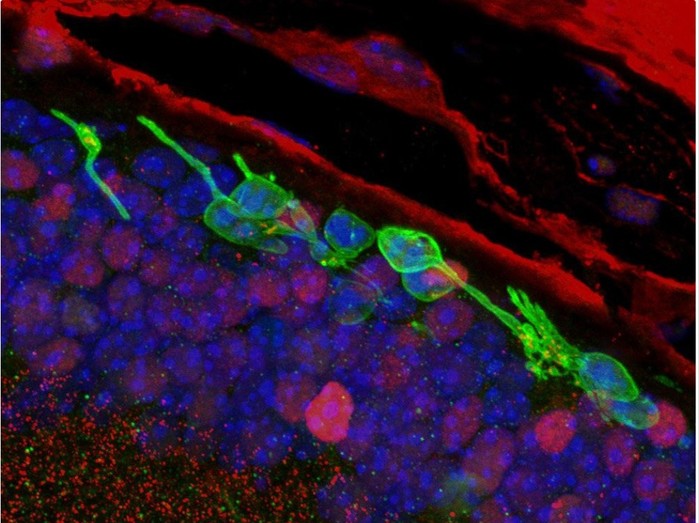 ▲ 이 면역 형광 이미지는 마우스 망막에 이식된 대체 광 감각 세포 (녹색)를 보여준다. © Sai Chavala |