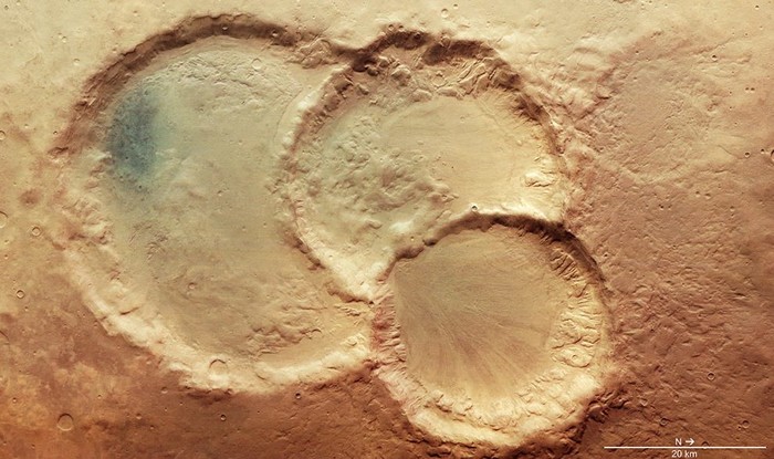 상대적으로 비슷하고 겹치는 분화구는 화성에서 드물다. 연구원들은 이 트리오는 약 40억 년 전에 화성 대기를 파괴한 소행성에 의해 발생했다고 추측한다.
