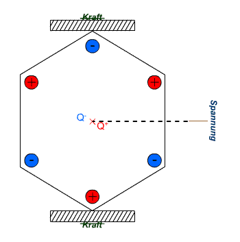 ▲ 직접 압전 효과 : 기계적 압력은 양극 (Q +)과 음극 전하 중심 (Q–)을 이동시킨다. 이것은 소자에 전기 전압 인 쌍극자를 생성한다. 출처: Degreen at German Wikipedia |