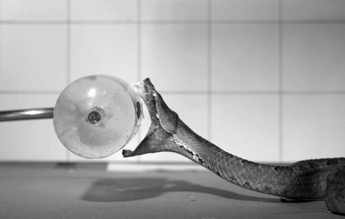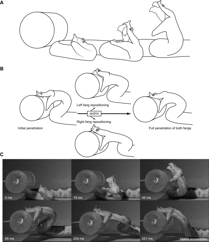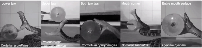 생물학자들은 먹이 대신 포유류의 피부와 근육과 유사한 점도를 가진 두께 10cm 미만의 젤 원통을 사용했다. 젤은 체온 정도로 데워졌고, 뱀이 물도록 두 개의 눈을 그렸다. 이 실험에서 생물학자들은 두 대의 고속 카메라를 사용하여 36종의 독사(독사, 콜루브리드 뱀, 맹그로브 뱀(Boiga dendrophila))의 물림을 다양한 각도에서 촬영했다.