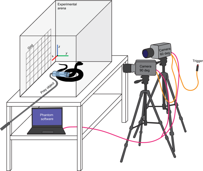 | ▲ 뱀 공격에 대한 일반적인 정원 장비 설정.실험장(140×70×70cm)에는 신선한 판지 바닥이 깔려 있었고, 외부의 방해 요소를 최소화하기 위해 뒷면과 오른쪽 패널은 블라인드로 처리했습니다.두 대의 고속 Phantom Miro M110 카메라를 뱀 공격 방향에 대해 90도와 60도 각도로 배치했다.카메라는 지속적으로 녹화하고 플래시 드라이브에 비디오 영상을 임시로 저장했다.뱀이 공격을 마친 후 카메라가 트리거되고(주황색 케이블) 이전 4000개 프레임이 플래시 드라이브에서 컴퓨터(분홍색 케이블)로 저장되었다.실험 워크플로우: (1) 일반 하우징에서 실험장으로 뱀을 옮김; (2) 5분 적응; (3) 뱀 취급 후크에 장착된 먹이 물체 도입; (4) 뱀 공격; (5) 트리거 눌림; (6) 컴퓨터에서 녹화 확인; (7) 세 번의 성공적인 공격이 기록되거나 뱀이 먹이에 관심을 보이지 않을 때까지 이전 단계 반복 (출처:23 October 2025 / Kinematics of strikes in venomous snakes / Journal of Experimental Biology) |