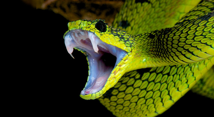 | ▲ 고속 촬영된 영상에서 독사는 다양한 방식으로 문다. 사진 속 독사(Atheris nitschei)는 덤불살모사(Atheris nitschei)를 물고 있다. © reptiles4all/ Getty Images |